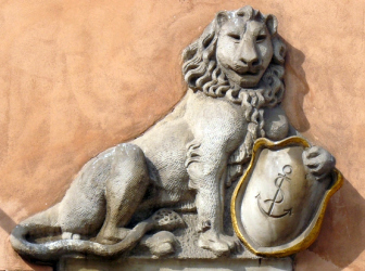lewym płaskorzeźba lwa trzymającego tarczę z kotwicą i