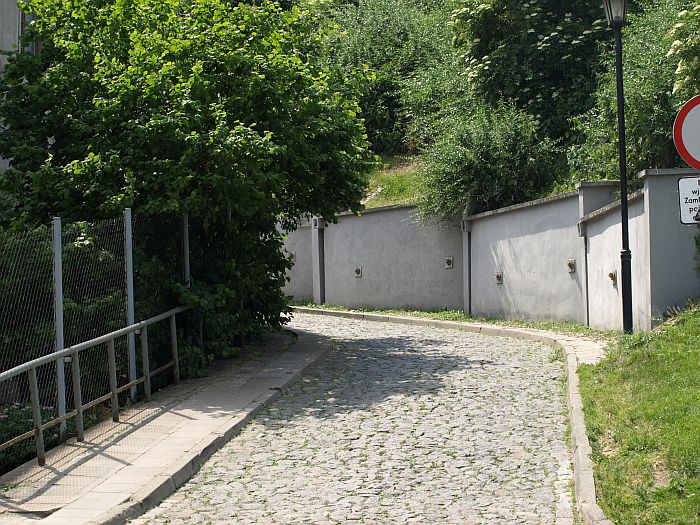 Uliczka z dwoma wąskimi chodnikami, opasana