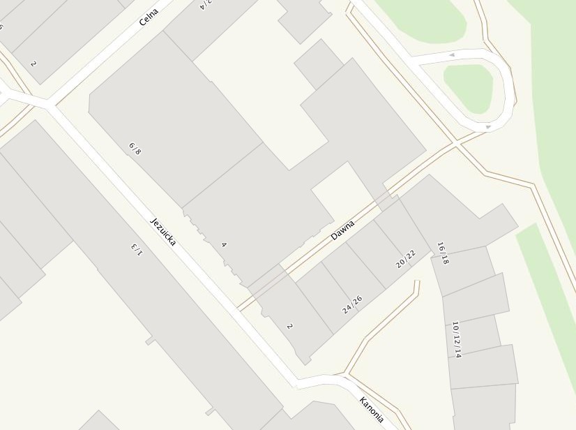 Ulica Jezuicka biegnie równolegle do Świętojańskiej (i do Wisły) od Kanonii do narożnika Celnej, gdzie łączy się z Rynkiem Starego Miasta. Numeracja nieparzysta po stronie zachodniej dotyczy jednej pierzei oznaczonej numerem 1/3. Po stronie wschodniej numeracja zaczyna się od Kanonii i obejmuje 4 kamienice.